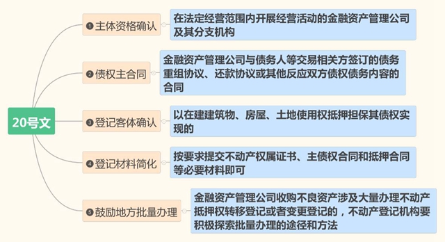 20號文中,強調(diào)不動產(chǎn)登記機構要積極探索批量辦理的途徑和方法,切實做到依法規(guī)范、高效便利,為金融資產(chǎn)管理公司健康發(fā)展提供有力保障。