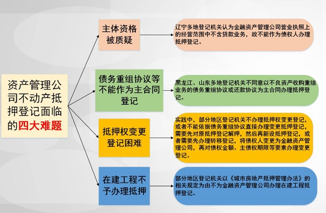很多地區(qū)登記機關認為,上述規(guī)定中在建工程抵押人只能為的“銀行”、貸款用途只能以“在建工程繼續(xù)建設”,因此拒絕為資管公司辦理不動產(chǎn)抵押登記或者變更登記。